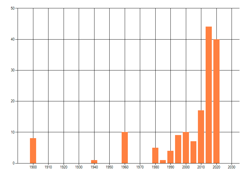 Het aantal atlasblokken (5x5 km) waarin de soort is gemeld binnen een periode van vijf jaar (vanaf 1980) of twintig jaar. Niet gecorrigeerd voor waarnemersinspanning en het aantal doorgegeven waarnemingen kan sterk variëren per periode, dus een trend in verspreiding kan hier niet direct uit worden afgelezen. Het opgegeven jaartal is het eerste jaar van de periode. Bron: gevalideerde waarnemingen uit de NDFF.