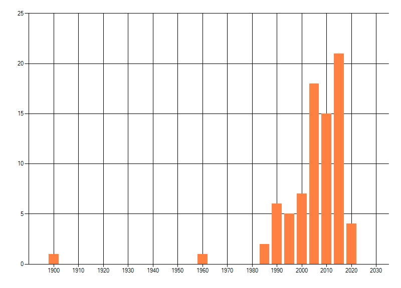 Het aantal atlasblokken (5x5 km) waarin de soort is gemeld binnen een periode van vijf jaar (vanaf 1980) of twintig jaar. Niet gecorrigeerd voor waarnemersinspanning en het aantal doorgegeven waarnemingen kan sterk variëren per periode, dus een trend in verspreiding kan hier niet direct uit worden afgelezen. Het opgegeven jaartal is het eerste jaar van de periode. Bron: gevalideerde waarnemingen uit de NDFF.