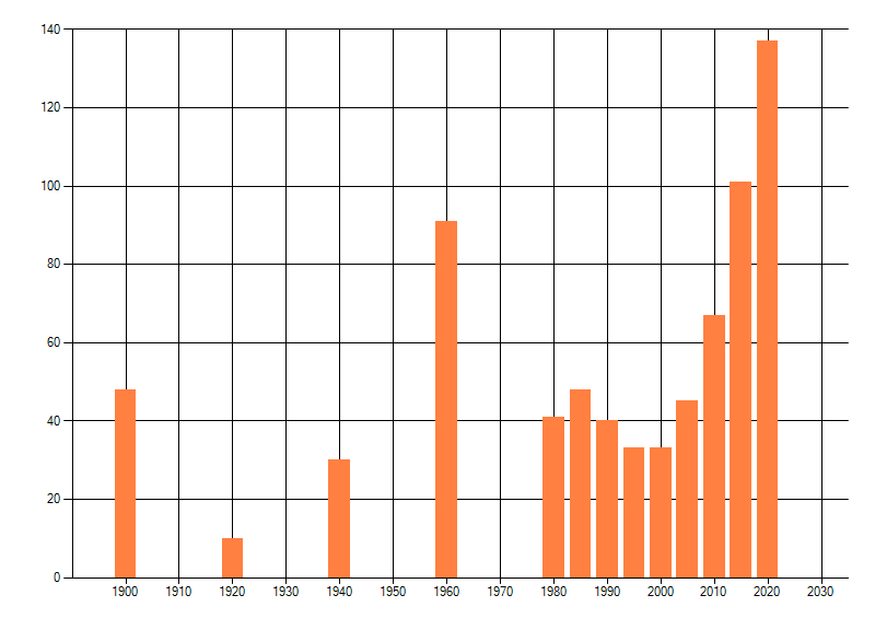 Het aantal atlasblokken (5x5 km) waarin de soort is gemeld binnen een periode van vijf jaar (vanaf 1980) of twintig jaar. Niet gecorrigeerd voor waarnemersinspanning en het aantal doorgegeven waarnemingen kan sterk variëren per periode, dus een trend in verspreiding kan hier niet direct uit worden afgelezen. Het opgegeven jaartal is het eerste jaar van de periode. Bron: gevalideerde waarnemingen uit de NDFF.