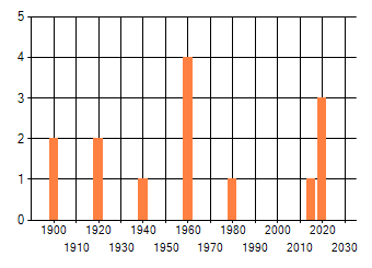 Het aantal atlasblokken (5x5 km) waarin de soort is gemeld binnen een periode van vijf jaar (vanaf 1980) of twintig jaar. Niet gecorrigeerd voor waarnemersinspanning en het aantal doorgegeven waarnemingen kan sterk variëren per periode, dus een trend in verspreiding kan hier niet direct uit worden afgelezen. Het opgegeven jaartal is het eerste jaar van de periode. Bron: gevalideerde waarnemingen uit de NDFF.