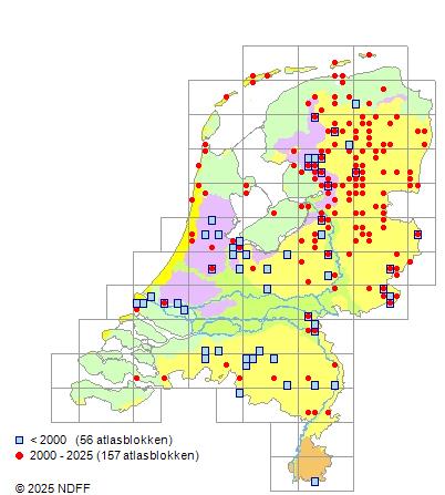 Het aantal atlasblokken (5x5 km) waarin de soort is gemeld binnen een periode van vijf jaar (vanaf 1980) of twintig jaar. Niet gecorrigeerd voor waarnemersinspanning en het aantal doorgegeven waarnemingen kan sterk variëren per periode, dus een trend in verspreiding kan hier niet direct uit worden afgelezen. Het opgegeven jaartal is het eerste jaar van de periode. Bron: gevalideerde waarnemingen uit de NDFF.