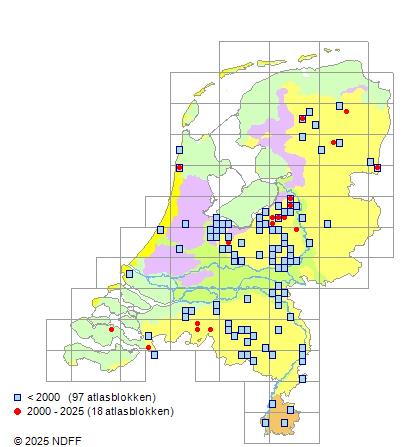 Het aantal atlasblokken (5x5 km) waarin de soort is gemeld binnen een periode van vijf jaar (vanaf 1980) of twintig jaar. Niet gecorrigeerd voor waarnemersinspanning en het aantal doorgegeven waarnemingen kan sterk variëren per periode, dus een trend in verspreiding kan hier niet direct uit worden afgelezen. Het opgegeven jaartal is het eerste jaar van de periode. Bron: gevalideerde waarnemingen uit de NDFF.