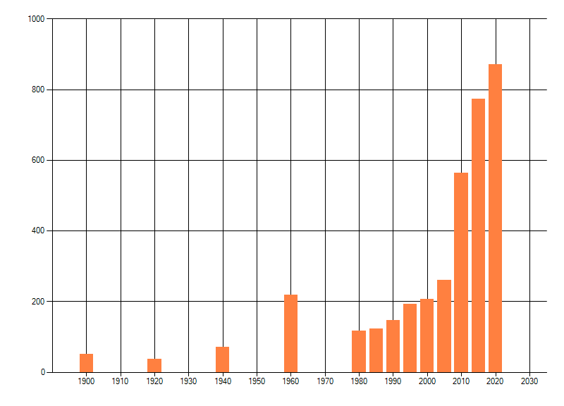 Het aantal atlasblokken (5x5 km) waarin de soort is gemeld binnen een periode van vijf jaar (vanaf 1980) of twintig jaar. Niet gecorrigeerd voor waarnemersinspanning en het aantal doorgegeven waarnemingen kan sterk variëren per periode, dus een trend in verspreiding kan hier niet direct uit worden afgelezen. Het opgegeven jaartal is het eerste jaar van de periode. Bron: gevalideerde waarnemingen uit de NDFF.