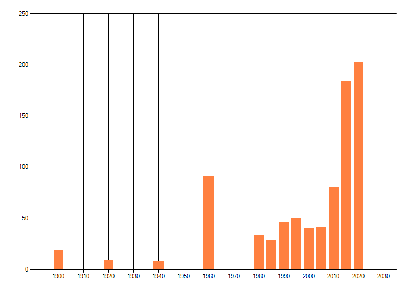 Het aantal atlasblokken (5x5 km) waarin de soort is gemeld binnen een periode van vijf jaar (vanaf 1980) of twintig jaar. Niet gecorrigeerd voor waarnemersinspanning en het aantal doorgegeven waarnemingen kan sterk variëren per periode, dus een trend in verspreiding kan hier niet direct uit worden afgelezen. Het opgegeven jaartal is het eerste jaar van de periode. Bron: gevalideerde waarnemingen uit de NDFF.