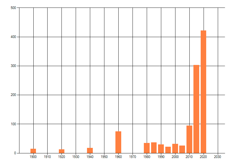 Het aantal atlasblokken (5x5 km) waarin de soort is gemeld binnen een periode van vijf jaar (vanaf 1980) of twintig jaar. Niet gecorrigeerd voor waarnemersinspanning en het aantal doorgegeven waarnemingen kan sterk variëren per periode, dus een trend in verspreiding kan hier niet direct uit worden afgelezen. Het opgegeven jaartal is het eerste jaar van de periode. Bron: gevalideerde waarnemingen uit de NDFF.