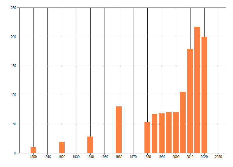 Het aantal atlasblokken (5x5 km) waarin de soort is gemeld binnen een periode van vijf jaar (vanaf 1980) of twintig jaar. Niet gecorrigeerd voor waarnemersinspanning en het aantal doorgegeven waarnemingen kan sterk variëren per periode, dus een trend in verspreiding kan hier niet direct uit worden afgelezen. Het opgegeven jaartal is het eerste jaar van de periode. Bron: gevalideerde waarnemingen uit de NDFF.