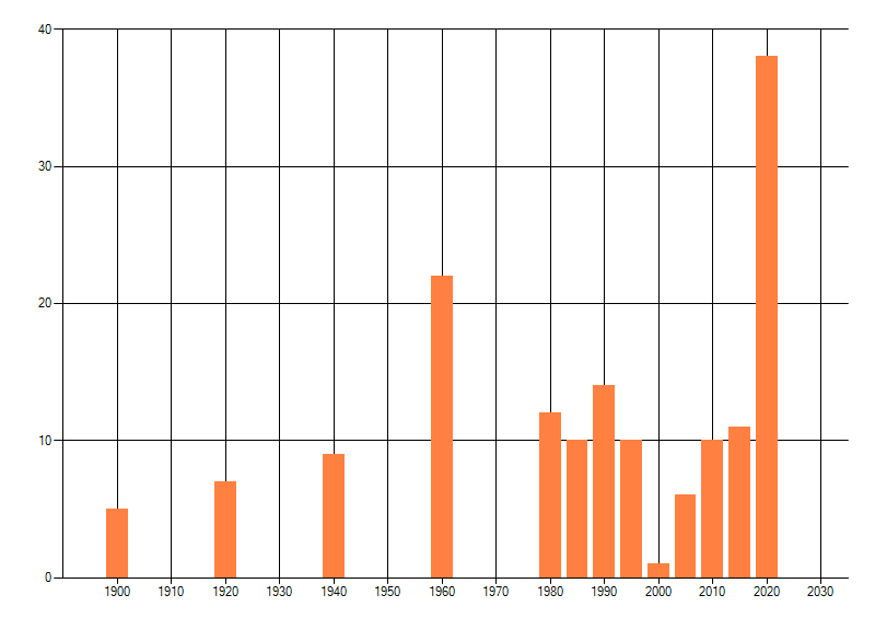 Het aantal atlasblokken (5x5 km) waarin de soort is gemeld binnen een periode van vijf jaar (vanaf 1980) of twintig jaar. Niet gecorrigeerd voor waarnemersinspanning en het aantal doorgegeven waarnemingen kan sterk variëren per periode, dus een trend in verspreiding kan hier niet direct uit worden afgelezen. Het opgegeven jaartal is het eerste jaar van de periode. Bron: gevalideerde waarnemingen uit de NDFF.