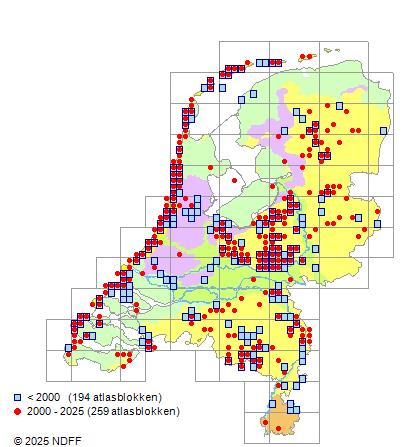 Het aantal atlasblokken (5x5 km) waarin de soort is gemeld binnen een periode van vijf jaar (vanaf 1980) of twintig jaar. Niet gecorrigeerd voor waarnemersinspanning en het aantal doorgegeven waarnemingen kan sterk variëren per periode, dus een trend in verspreiding kan hier niet direct uit worden afgelezen. Het opgegeven jaartal is het eerste jaar van de periode. Bron: gevalideerde waarnemingen uit de NDFF.