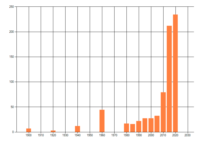 Het aantal atlasblokken (5x5 km) waarin de soort is gemeld binnen een periode van vijf jaar (vanaf 1980) of twintig jaar. Niet gecorrigeerd voor waarnemersinspanning en het aantal doorgegeven waarnemingen kan sterk variëren per periode, dus een trend in verspreiding kan hier niet direct uit worden afgelezen. Het opgegeven jaartal is het eerste jaar van de periode. Bron: gevalideerde waarnemingen uit de NDFF.