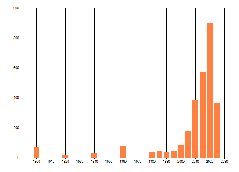 Het aantal atlasblokken (5x5 km) waarin de soort is gemeld binnen een periode van vijf jaar (vanaf 1980) of twintig jaar. Niet gecorrigeerd voor waarnemersinspanning en het aantal doorgegeven waarnemingen kan sterk variëren per periode, dus een trend in verspreiding kan hier niet direct uit worden afgelezen. Het opgegeven jaartal is het eerste jaar van de periode. Bron: gevalideerde waarnemingen uit de NDFF.