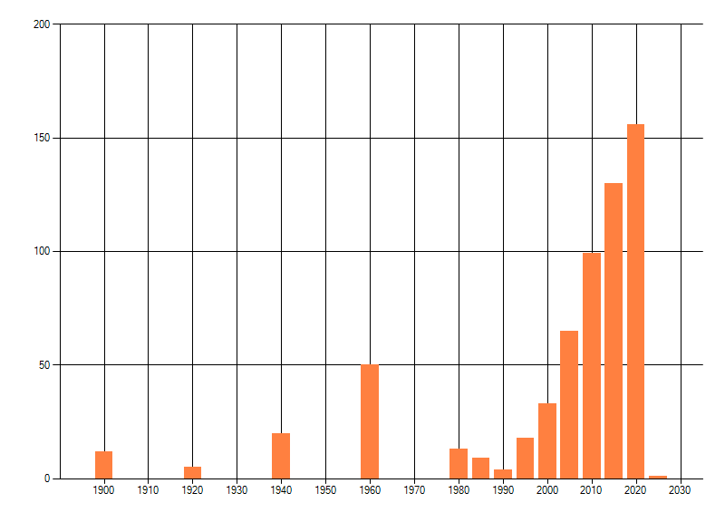 Het aantal atlasblokken (5x5 km) waarin de soort is gemeld binnen een periode van vijf jaar (vanaf 1980) of twintig jaar. Niet gecorrigeerd voor waarnemersinspanning en het aantal doorgegeven waarnemingen kan sterk variëren per periode, dus een trend in verspreiding kan hier niet direct uit worden afgelezen. Het opgegeven jaartal is het eerste jaar van de periode. Bron: gevalideerde waarnemingen uit de NDFF.