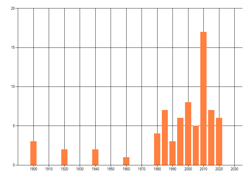Het aantal atlasblokken (5x5 km) waarin de soort is gemeld binnen een periode van vijf jaar (vanaf 1980) of twintig jaar. Niet gecorrigeerd voor waarnemersinspanning en het aantal doorgegeven waarnemingen kan sterk variëren per periode, dus een trend in verspreiding kan hier niet direct uit worden afgelezen. Het opgegeven jaartal is het eerste jaar van de periode. Bron: gevalideerde waarnemingen uit de NDFF.