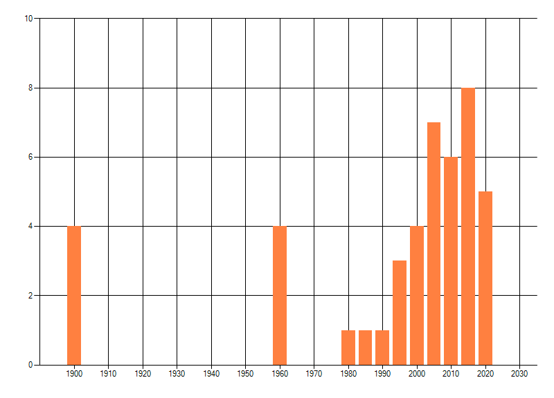 Het aantal atlasblokken (5x5 km) waarin de soort is gemeld binnen een periode van vijf jaar (vanaf 1980) of twintig jaar. Niet gecorrigeerd voor waarnemersinspanning en het aantal doorgegeven waarnemingen kan sterk variëren per periode, dus een trend in verspreiding kan hier niet direct uit worden afgelezen. Het opgegeven jaartal is het eerste jaar van de periode. Bron: gevalideerde waarnemingen uit de NDFF.