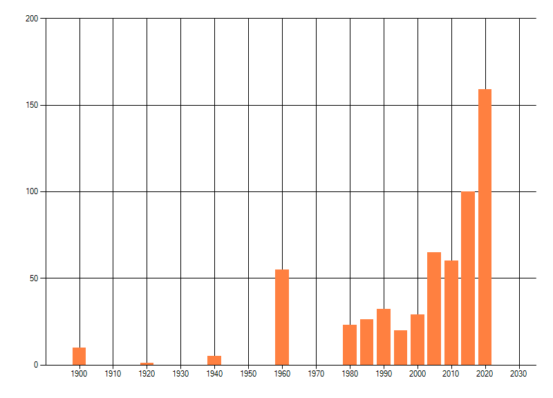 Het aantal atlasblokken (5x5 km) waarin de soort is gemeld binnen een periode van vijf jaar (vanaf 1980) of twintig jaar. Niet gecorrigeerd voor waarnemersinspanning en het aantal doorgegeven waarnemingen kan sterk variëren per periode, dus een trend in verspreiding kan hier niet direct uit worden afgelezen. Het opgegeven jaartal is het eerste jaar van de periode. Bron: gevalideerde waarnemingen uit de NDFF.