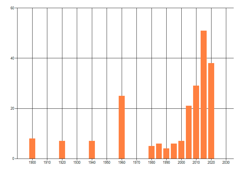 Het aantal atlasblokken (5x5 km) waarin de soort is gemeld binnen een periode van vijf jaar (vanaf 1980) of twintig jaar. Niet gecorrigeerd voor waarnemersinspanning en het aantal doorgegeven waarnemingen kan sterk variëren per periode, dus een trend in verspreiding kan hier niet direct uit worden afgelezen. Het opgegeven jaartal is het eerste jaar van de periode. Bron: gevalideerde waarnemingen uit de NDFF.
