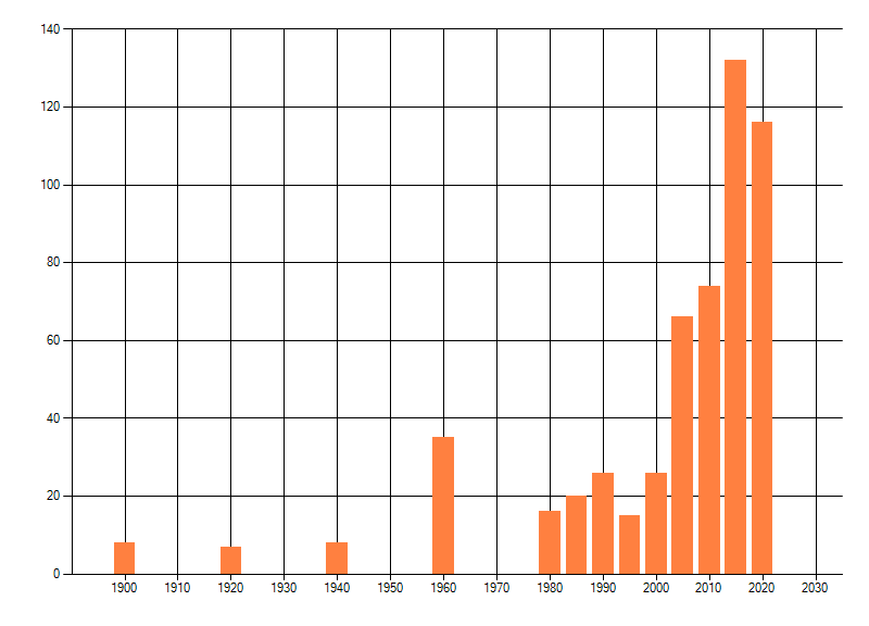 Het aantal atlasblokken (5x5 km) waarin de soort is gemeld binnen een periode van vijf jaar (vanaf 1980) of twintig jaar. Niet gecorrigeerd voor waarnemersinspanning en het aantal doorgegeven waarnemingen kan sterk variëren per periode, dus een trend in verspreiding kan hier niet direct uit worden afgelezen. Het opgegeven jaartal is het eerste jaar van de periode. Bron: gevalideerde waarnemingen uit de NDFF.