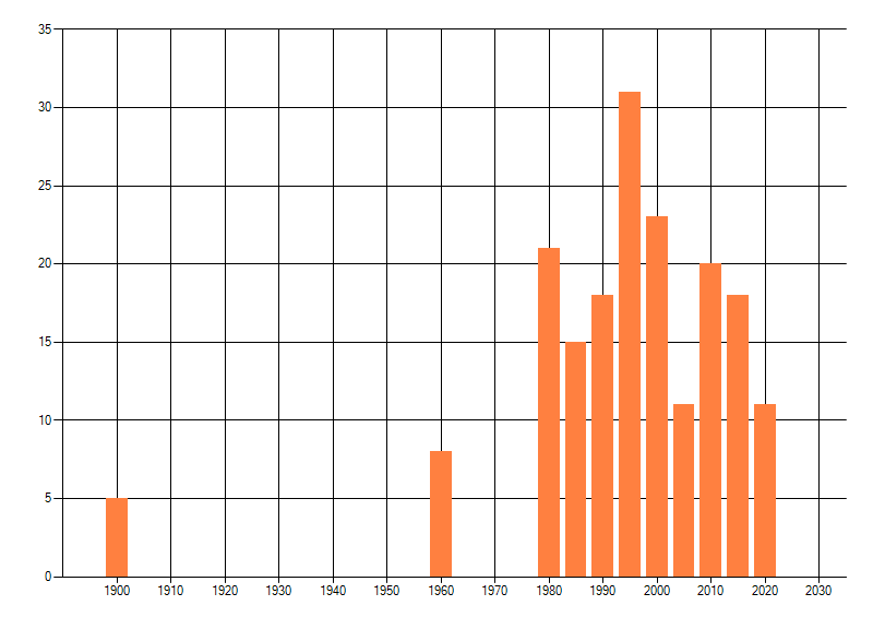 Het aantal atlasblokken (5x5 km) waarin de soort is gemeld binnen een periode van vijf jaar (vanaf 1980) of twintig jaar. Niet gecorrigeerd voor waarnemersinspanning en het aantal doorgegeven waarnemingen kan sterk variëren per periode, dus een trend in verspreiding kan hier niet direct uit worden afgelezen. Het opgegeven jaartal is het eerste jaar van de periode. Bron: gevalideerde waarnemingen uit de NDFF.