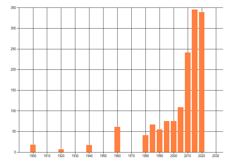 Het aantal atlasblokken (5x5 km) waarin de soort is gemeld binnen een periode van vijf jaar (vanaf 1980) of twintig jaar. Niet gecorrigeerd voor waarnemersinspanning en het aantal doorgegeven waarnemingen kan sterk variëren per periode, dus een trend in verspreiding kan hier niet direct uit worden afgelezen. Het opgegeven jaartal is het eerste jaar van de periode. Bron: gevalideerde waarnemingen uit de NDFF.
