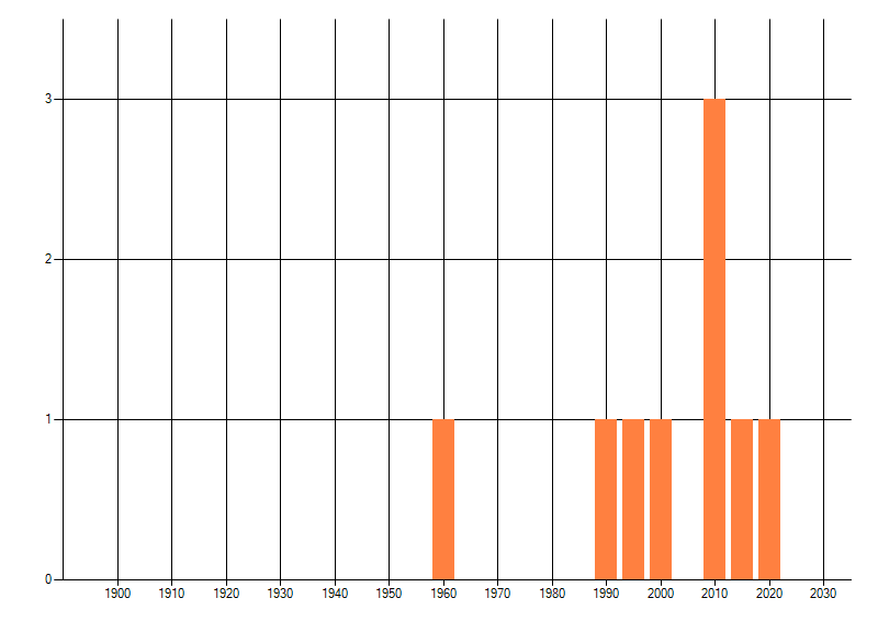 Het aantal atlasblokken (5x5 km) waarin de soort is gemeld binnen een periode van vijf jaar (vanaf 1980) of twintig jaar. Niet gecorrigeerd voor waarnemersinspanning en het aantal doorgegeven waarnemingen kan sterk variëren per periode, dus een trend in verspreiding kan hier niet direct uit worden afgelezen. Het opgegeven jaartal is het eerste jaar van de periode. Bron: gevalideerde waarnemingen uit de NDFF.