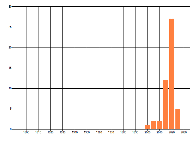 Het aantal atlasblokken (5x5 km) waarin de soort is gemeld binnen een periode van vijf jaar (vanaf 1980) of twintig jaar. Niet gecorrigeerd voor waarnemersinspanning en het aantal doorgegeven waarnemingen kan sterk variëren per periode, dus een trend in verspreiding kan hier niet direct uit worden afgelezen. Het opgegeven jaartal is het eerste jaar van de periode. Bron: gevalideerde waarnemingen uit de NDFF.