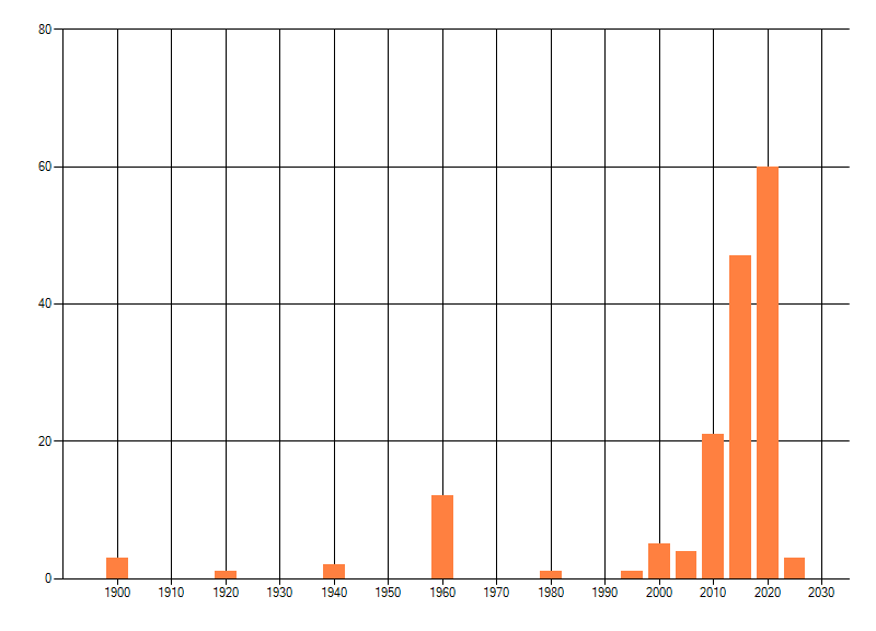 Het aantal atlasblokken (5x5 km) waarin de soort is gemeld binnen een periode van vijf jaar (vanaf 1980) of twintig jaar. Niet gecorrigeerd voor waarnemersinspanning en het aantal doorgegeven waarnemingen kan sterk variëren per periode, dus een trend in verspreiding kan hier niet direct uit worden afgelezen. Het opgegeven jaartal is het eerste jaar van de periode. Bron: gevalideerde waarnemingen uit de NDFF.