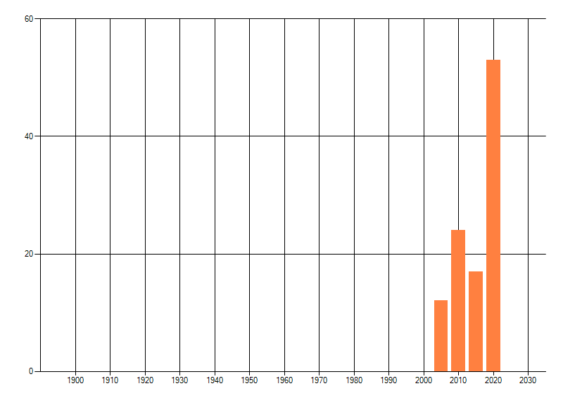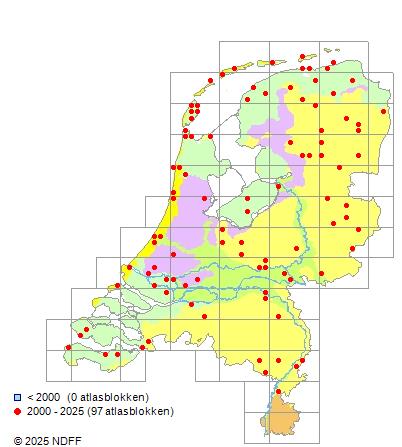Het aantal atlasblokken (5x5 km) waarin de soort is gemeld binnen een periode van vijf jaar (vanaf 1980) of twintig jaar. Niet gecorrigeerd voor waarnemersinspanning en het aantal doorgegeven waarnemingen kan sterk variëren per periode, dus een trend in verspreiding kan hier niet direct uit worden afgelezen. Het opgegeven jaartal is het eerste jaar van de periode. Bron: gevalideerde waarnemingen uit de NDFF.