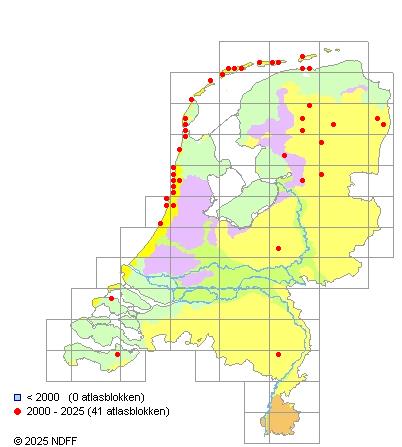 Het aantal atlasblokken (5x5 km) waarin de soort is gemeld binnen een periode van vijf jaar (vanaf 1980) of twintig jaar. Niet gecorrigeerd voor waarnemersinspanning en het aantal doorgegeven waarnemingen kan sterk variëren per periode, dus een trend in verspreiding kan hier niet direct uit worden afgelezen. Het opgegeven jaartal is het eerste jaar van de periode. Bron: gevalideerde waarnemingen uit de NDFF.