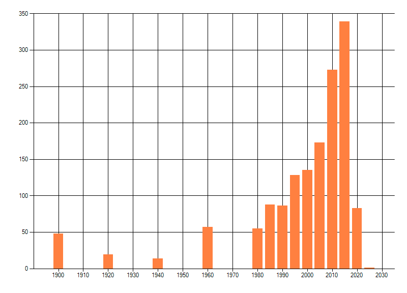 Het aantal atlasblokken (5x5 km) waarin de soort is gemeld binnen een periode van vijf jaar (vanaf 1980) of twintig jaar. Niet gecorrigeerd voor waarnemersinspanning en het aantal doorgegeven waarnemingen kan sterk variëren per periode, dus een trend in verspreiding kan hier niet direct uit worden afgelezen. Het opgegeven jaartal is het eerste jaar van de periode. Bron: gevalideerde waarnemingen uit de NDFF.