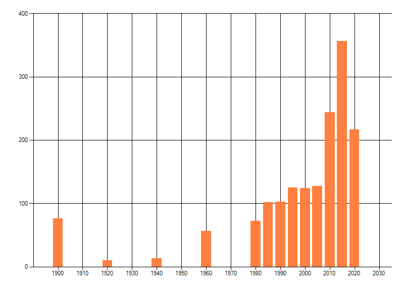 Het aantal atlasblokken (5x5 km) waarin de soort is gemeld binnen een periode van vijf jaar (vanaf 1980) of twintig jaar. Niet gecorrigeerd voor waarnemersinspanning en het aantal doorgegeven waarnemingen kan sterk variëren per periode, dus een trend in verspreiding kan hier niet direct uit worden afgelezen. Het opgegeven jaartal is het eerste jaar van de periode. Bron: gevalideerde waarnemingen uit de NDFF.
