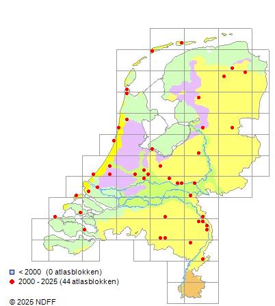 Het aantal atlasblokken (5x5 km) waarin de soort is gemeld binnen een periode van vijf jaar (vanaf 1980) of twintig jaar. Niet gecorrigeerd voor waarnemersinspanning en het aantal doorgegeven waarnemingen kan sterk variëren per periode, dus een trend in verspreiding kan hier niet direct uit worden afgelezen. Het opgegeven jaartal is het eerste jaar van de periode. Bron: gevalideerde waarnemingen uit de NDFF.