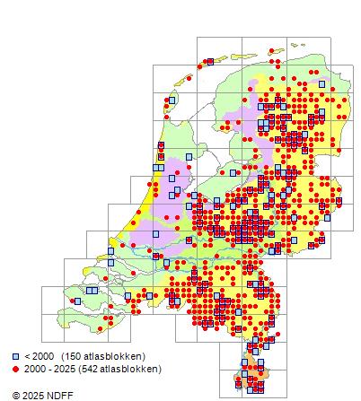 Het aantal atlasblokken (5x5 km) waarin de soort is gemeld binnen een periode van vijf jaar (vanaf 1980) of twintig jaar. Niet gecorrigeerd voor waarnemersinspanning en het aantal doorgegeven waarnemingen kan sterk variëren per periode, dus een trend in verspreiding kan hier niet direct uit worden afgelezen. Het opgegeven jaartal is het eerste jaar van de periode. Bron: gevalideerde waarnemingen uit de NDFF.