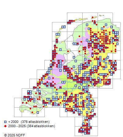 Het aantal atlasblokken (5x5 km) waarin de soort is gemeld binnen een periode van vijf jaar (vanaf 1980) of twintig jaar. Niet gecorrigeerd voor waarnemersinspanning en het aantal doorgegeven waarnemingen kan sterk variëren per periode, dus een trend in verspreiding kan hier niet direct uit worden afgelezen. Het opgegeven jaartal is het eerste jaar van de periode. Bron: gevalideerde waarnemingen uit de NDFF.