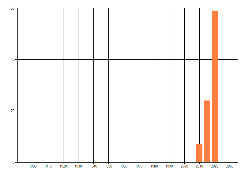 Het aantal atlasblokken (5x5 km) waarin de soort is gemeld binnen een periode van vijf jaar (vanaf 1980) of twintig jaar. Niet gecorrigeerd voor waarnemersinspanning en het aantal doorgegeven waarnemingen kan sterk variëren per periode, dus een trend in verspreiding kan hier niet direct uit worden afgelezen. Het opgegeven jaartal is het eerste jaar van de periode. Bron: gevalideerde waarnemingen uit de NDFF.