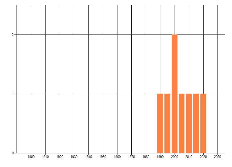Het aantal atlasblokken (5x5 km) waarin de soort is gemeld binnen een periode van vijf jaar (vanaf 1980) of twintig jaar. Niet gecorrigeerd voor waarnemersinspanning en het aantal doorgegeven waarnemingen kan sterk variëren per periode, dus een trend in verspreiding kan hier niet direct uit worden afgelezen. Het opgegeven jaartal is het eerste jaar van de periode. Bron: gevalideerde waarnemingen uit de NDFF.