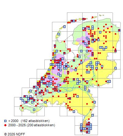 Het aantal atlasblokken (5x5 km) waarin de soort is gemeld binnen een periode van vijf jaar (vanaf 1980) of twintig jaar. Niet gecorrigeerd voor waarnemersinspanning en het aantal doorgegeven waarnemingen kan sterk variëren per periode, dus een trend in verspreiding kan hier niet direct uit worden afgelezen. Het opgegeven jaartal is het eerste jaar van de periode. Bron: gevalideerde waarnemingen uit de NDFF.