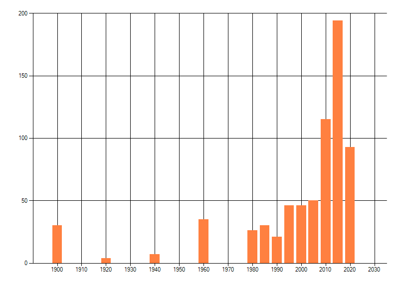 Het aantal atlasblokken (5x5 km) waarin de soort is gemeld binnen een periode van vijf jaar (vanaf 1980) of twintig jaar. Niet gecorrigeerd voor waarnemersinspanning en het aantal doorgegeven waarnemingen kan sterk variëren per periode, dus een trend in verspreiding kan hier niet direct uit worden afgelezen. Het opgegeven jaartal is het eerste jaar van de periode. Bron: gevalideerde waarnemingen uit de NDFF.