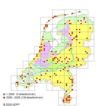 Het aantal atlasblokken (5x5 km) waarin de soort is gemeld binnen een periode van vijf jaar (vanaf 1980) of twintig jaar. Niet gecorrigeerd voor waarnemersinspanning en het aantal doorgegeven waarnemingen kan sterk variëren per periode, dus een trend in verspreiding kan hier niet direct uit worden afgelezen. Het opgegeven jaartal is het eerste jaar van de periode. Bron: gevalideerde waarnemingen uit de NDFF.