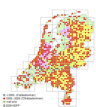 Het aantal atlasblokken (5x5 km) waarin de soort is gemeld binnen een periode van vijf jaar (vanaf 1980) of twintig jaar. Niet gecorrigeerd voor waarnemersinspanning en het aantal doorgegeven waarnemingen kan sterk variëren per periode, dus een trend in verspreiding kan hier niet direct uit worden afgelezen. Het opgegeven jaartal is het eerste jaar van de periode. Bron: gevalideerde waarnemingen uit de NDFF.