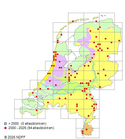 Het aantal atlasblokken (5x5 km) waarin de soort is gemeld binnen een periode van vijf jaar (vanaf 1980) of twintig jaar. Niet gecorrigeerd voor waarnemersinspanning en het aantal doorgegeven waarnemingen kan sterk variëren per periode, dus een trend in verspreiding kan hier niet direct uit worden afgelezen. Het opgegeven jaartal is het eerste jaar van de periode. Bron: gevalideerde waarnemingen uit de NDFF.