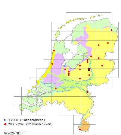 Het aantal atlasblokken (5x5 km) waarin de soort is gemeld binnen een periode van vijf jaar (vanaf 1980) of twintig jaar. Niet gecorrigeerd voor waarnemersinspanning en het aantal doorgegeven waarnemingen kan sterk variëren per periode, dus een trend in verspreiding kan hier niet direct uit worden afgelezen. Het opgegeven jaartal is het eerste jaar van de periode. Bron: gevalideerde waarnemingen uit de NDFF.
