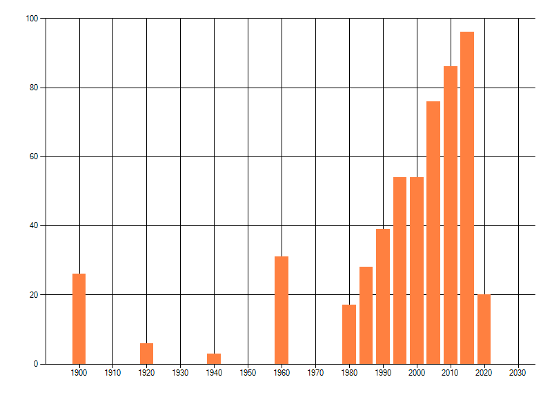 Het aantal atlasblokken (5x5 km) waarin de soort is gemeld binnen een periode van vijf jaar (vanaf 1980) of twintig jaar. Niet gecorrigeerd voor waarnemersinspanning en het aantal doorgegeven waarnemingen kan sterk variëren per periode, dus een trend in verspreiding kan hier niet direct uit worden afgelezen. Het opgegeven jaartal is het eerste jaar van de periode. Bron: gevalideerde waarnemingen uit de NDFF.