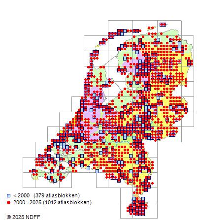 Het aantal atlasblokken (5x5 km) waarin de soort is gemeld binnen een periode van vijf jaar (vanaf 1980) of twintig jaar. Niet gecorrigeerd voor waarnemersinspanning en het aantal doorgegeven waarnemingen kan sterk variëren per periode, dus een trend in verspreiding kan hier niet direct uit worden afgelezen. Het opgegeven jaartal is het eerste jaar van de periode. Bron: gevalideerde waarnemingen uit de NDFF.