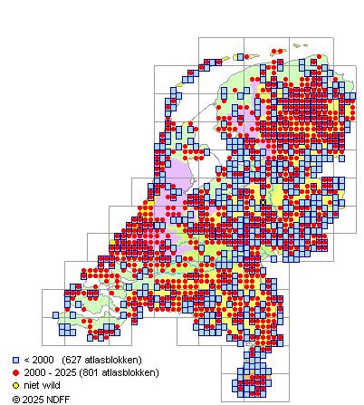 Het aantal atlasblokken (5x5 km) waarin de soort is gemeld binnen een periode van vijf jaar (vanaf 1980) of twintig jaar. Niet gecorrigeerd voor waarnemersinspanning en het aantal doorgegeven waarnemingen kan sterk variëren per periode, dus een trend in verspreiding kan hier niet direct uit worden afgelezen. Het opgegeven jaartal is het eerste jaar van de periode. Bron: gevalideerde waarnemingen uit de NDFF.