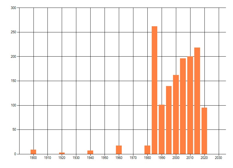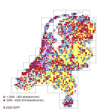 Het aantal atlasblokken (5x5 km) waarin de soort is gemeld binnen een periode van vijf jaar (vanaf 1980) of twintig jaar. Niet gecorrigeerd voor waarnemersinspanning en het aantal doorgegeven waarnemingen kan sterk variëren per periode, dus een trend in verspreiding kan hier niet direct uit worden afgelezen. Het opgegeven jaartal is het eerste jaar van de periode. Bron: gevalideerde waarnemingen uit de NDFF.