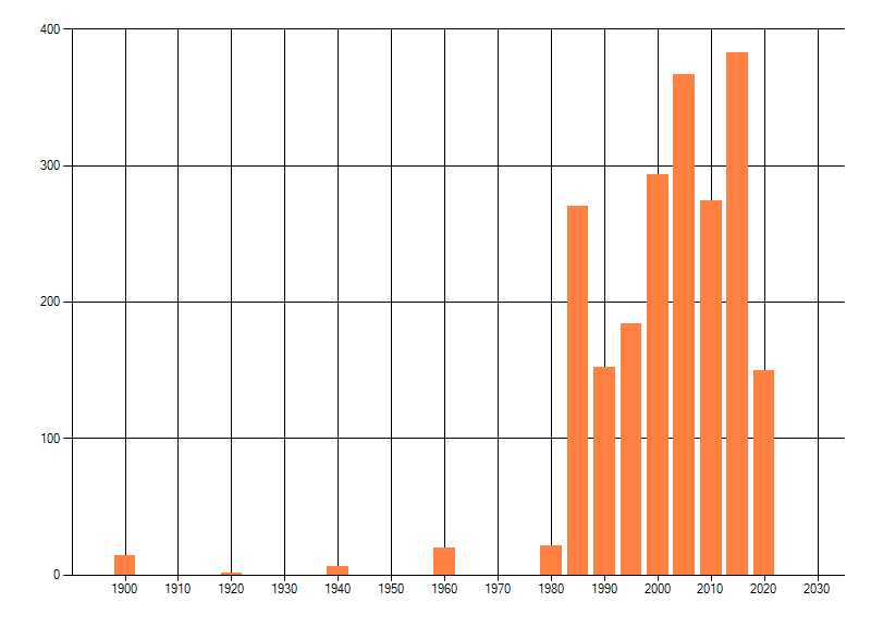 Het aantal atlasblokken (5x5 km) waarin de soort is gemeld binnen een periode van vijf jaar (vanaf 1980) of twintig jaar. Niet gecorrigeerd voor waarnemersinspanning en het aantal doorgegeven waarnemingen kan sterk variëren per periode, dus een trend in verspreiding kan hier niet direct uit worden afgelezen. Het opgegeven jaartal is het eerste jaar van de periode. Bron: gevalideerde waarnemingen uit de NDFF.