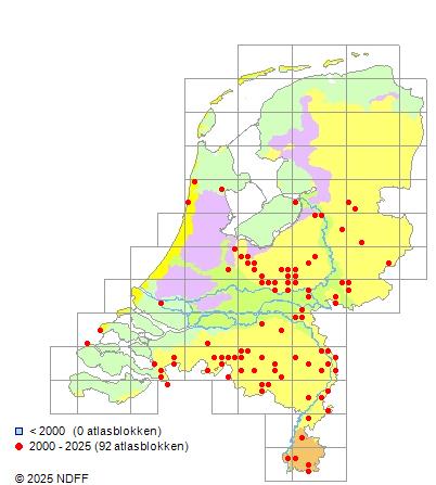 Het aantal atlasblokken (5x5 km) waarin de soort is gemeld binnen een periode van vijf jaar (vanaf 1980) of twintig jaar. Niet gecorrigeerd voor waarnemersinspanning en het aantal doorgegeven waarnemingen kan sterk variëren per periode, dus een trend in verspreiding kan hier niet direct uit worden afgelezen. Het opgegeven jaartal is het eerste jaar van de periode. Bron: gevalideerde waarnemingen uit de NDFF.