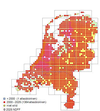 Het aantal atlasblokken (5x5 km) waarin de soort is gemeld binnen een periode van vijf jaar (vanaf 1980) of twintig jaar. Niet gecorrigeerd voor waarnemersinspanning en het aantal doorgegeven waarnemingen kan sterk variëren per periode, dus een trend in verspreiding kan hier niet direct uit worden afgelezen. Het opgegeven jaartal is het eerste jaar van de periode. Bron: gevalideerde waarnemingen uit de NDFF.
