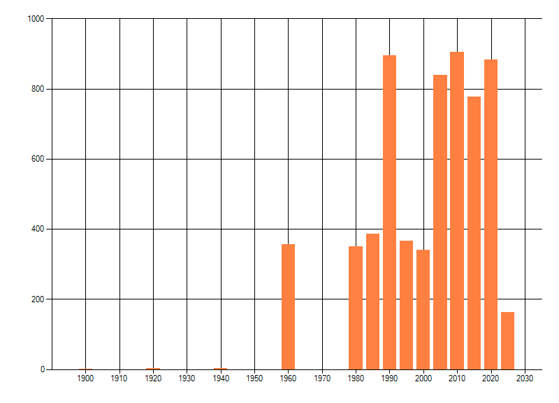 Het aantal atlasblokken (5x5 km) waarin de soort is gemeld binnen een periode van vijf jaar (vanaf 1980) of twintig jaar. Niet gecorrigeerd voor waarnemersinspanning en het aantal doorgegeven waarnemingen kan sterk variëren per periode, dus een trend in verspreiding kan hier niet direct uit worden afgelezen. Het opgegeven jaartal is het eerste jaar van de periode. Bron: gevalideerde waarnemingen uit de NDFF.