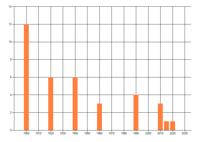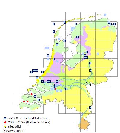 Het aantal atlasblokken (5x5 km) waarin de soort is gemeld binnen een periode van vijf jaar (vanaf 1980) of twintig jaar. Niet gecorrigeerd voor waarnemersinspanning en het aantal doorgegeven waarnemingen kan sterk variëren per periode, dus een trend in verspreiding kan hier niet direct uit worden afgelezen. Het opgegeven jaartal is het eerste jaar van de periode. Bron: gevalideerde waarnemingen uit de NDFF.