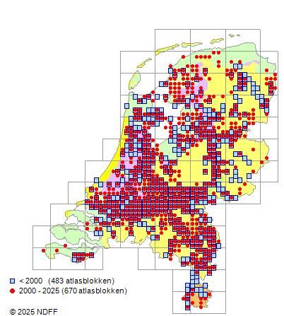 Het aantal atlasblokken (5x5 km) waarin de soort is gemeld binnen een periode van vijf jaar (vanaf 1980) of twintig jaar. Niet gecorrigeerd voor waarnemersinspanning en het aantal doorgegeven waarnemingen kan sterk variëren per periode, dus een trend in verspreiding kan hier niet direct uit worden afgelezen. Het opgegeven jaartal is het eerste jaar van de periode. Bron: gevalideerde waarnemingen uit de NDFF.